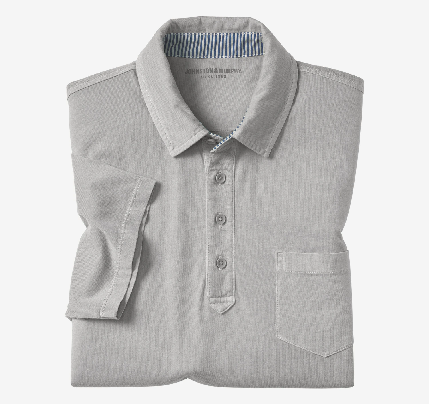 - Polo collar with inside striped neckband.
