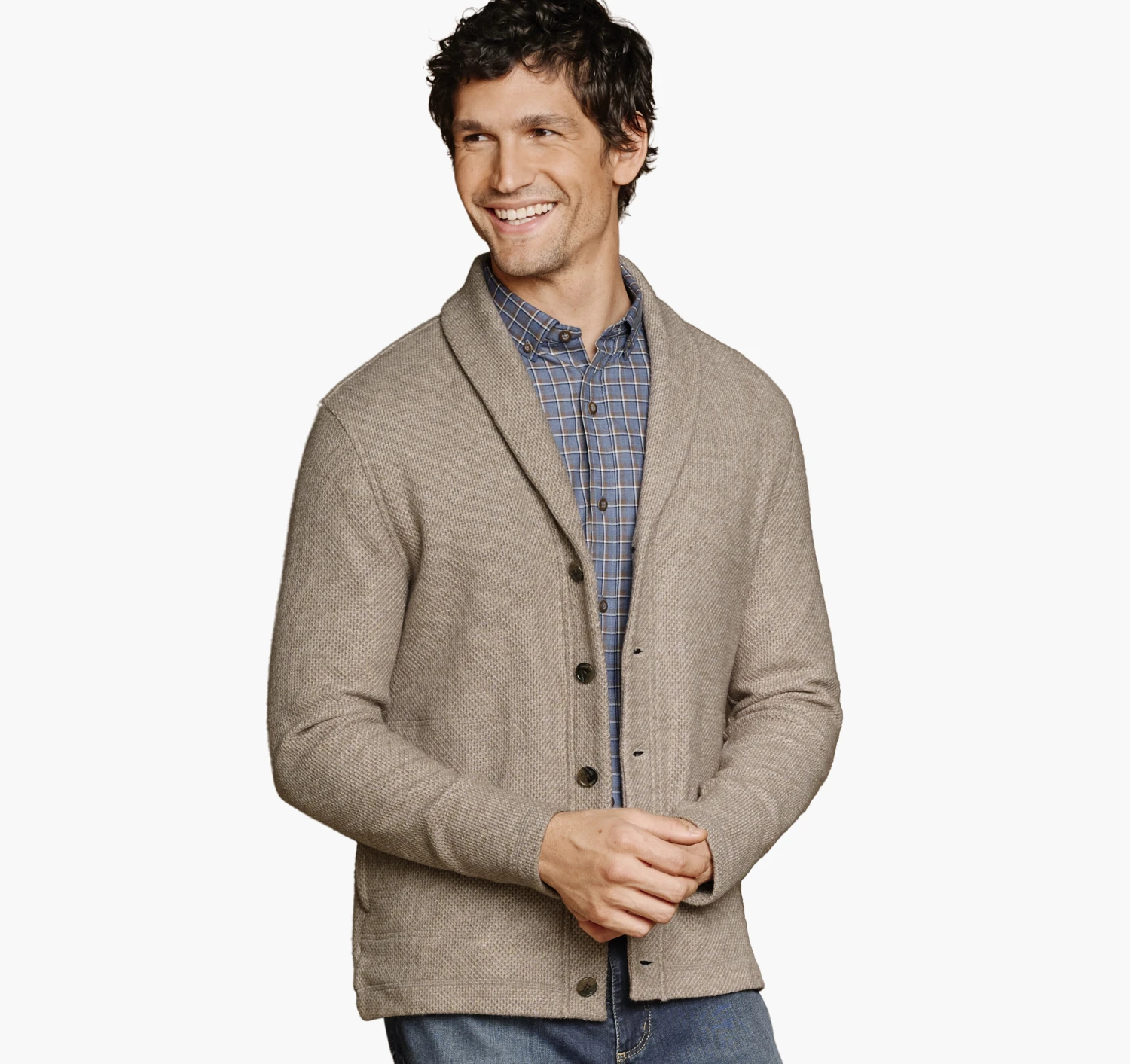 - A cozy cardigan in a soft, brushed knit with a tweedy texture.